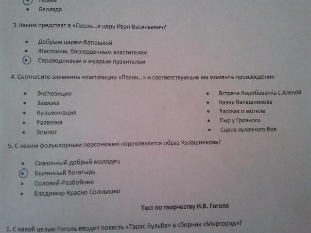 соотнесите элементы композиции "Песни про купца Калашникова"