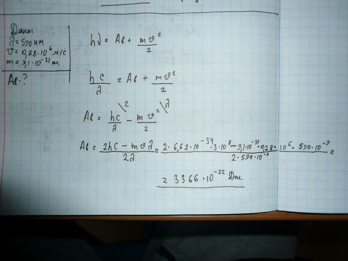 найти работу выхода электрона с поверхности металла, если при облучении его желтым светом с длиной волны 590 нм, скорость выбитых электронов равна 0,28 * 10^6 м/с