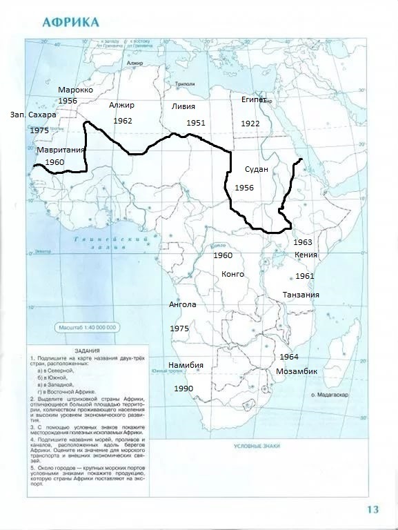 Пользуясь таблицей 1 в «Приложениях», нанесите на контурную карту страны Африки, получившие политическую независимость после второй мировой войны. Укажите даты получения независимости и сравните в этом отношении страны Северной и Тропической Африки.