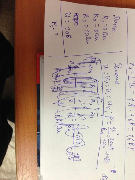 Определите мощность, потребляемую первой лампой, если R1= 3 Ом, R2= 6 Ом, R3= 10 Ом, а вольтметр показывает 30 В. ПОЖАЙЛУСТА ПОМОГИТЕ!!!