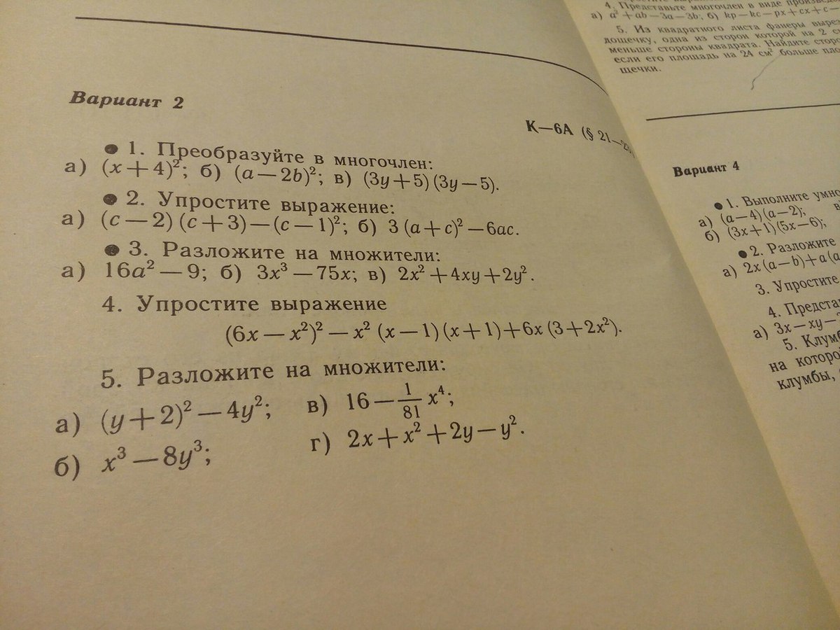 3. а) 16а^2-9=(4а-3)×(4а+3); б)3х^3-75х=3х×(х^2-25)=3х×(х-5)×(х+5); в) 2х^2+4ху+2у^2=2×(х^2+2ху+у^2)=2×(х+у)^2; 4. (6х-х^2)^2-х^2×(х-1)×(х+1)+6х×(3+2х^2)=36-12х^3+х^4-х^2×(х^2-1)+18х+12х^3=36-12х^3+х^4-х^4+х^2+18х+12х^3=х^2+18х+36; 5. а) (у+2)^2-4у^2=(у+2)^2-(2у)^2=(у+2-2у)×(у+2+2у)=(2-у)×(2+3у); б) х^3-8у^3=(х-2у)×(х^2+2ху+4у^2); в) 16-х^4/81=(4)^2-(х^2/9)^2=(4-х^2/9)×(4+х^2/9)=(2-х/3)×(2+х/3)×(4+х^2/9); г) 2х+х^2+2у-у^2=2×(х+у)+(х-у)×(х+у)=(х+у)×(2+х-у).