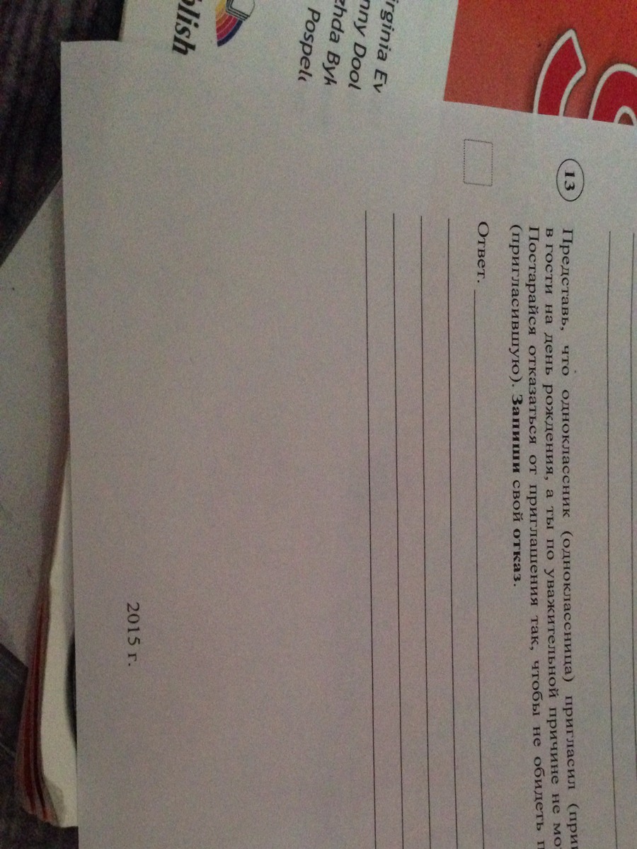 извини но я не могу. У мамы срочные дела! Я поехала с ней к врачу. Пожалуйста прости! Я потом все объясню!!!!!! В другой раз.