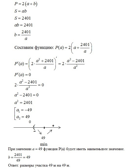 прямоугольный участок площадью 2401 м огораживают забором.какими должны быть размеры участка, чтобы периметр был наименьшим?
