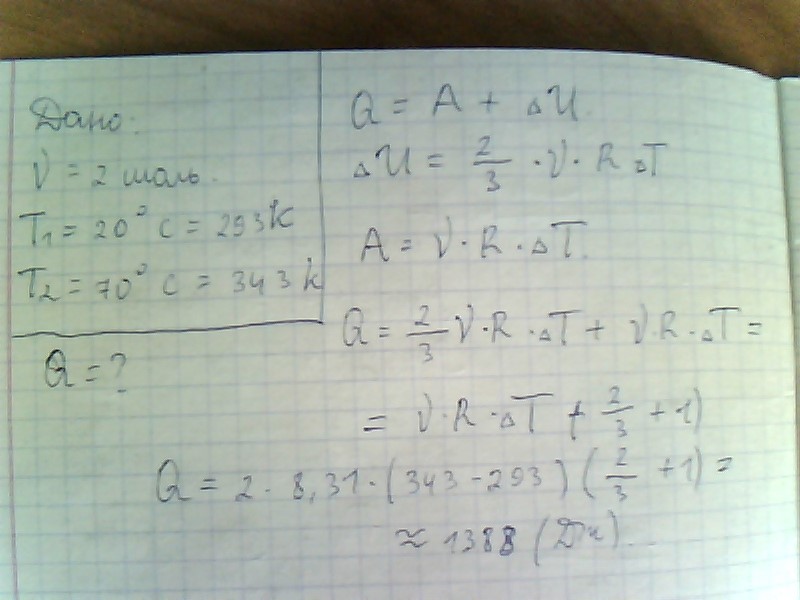 одноатомный газ в количестве 2 моль находится в цилиндре с подвижным поршнем под атмосферным давлением. в процессе его нагревания температура повысилась от 20 до 70 градусов по цельсию. какое количество теплоты было передано газу?