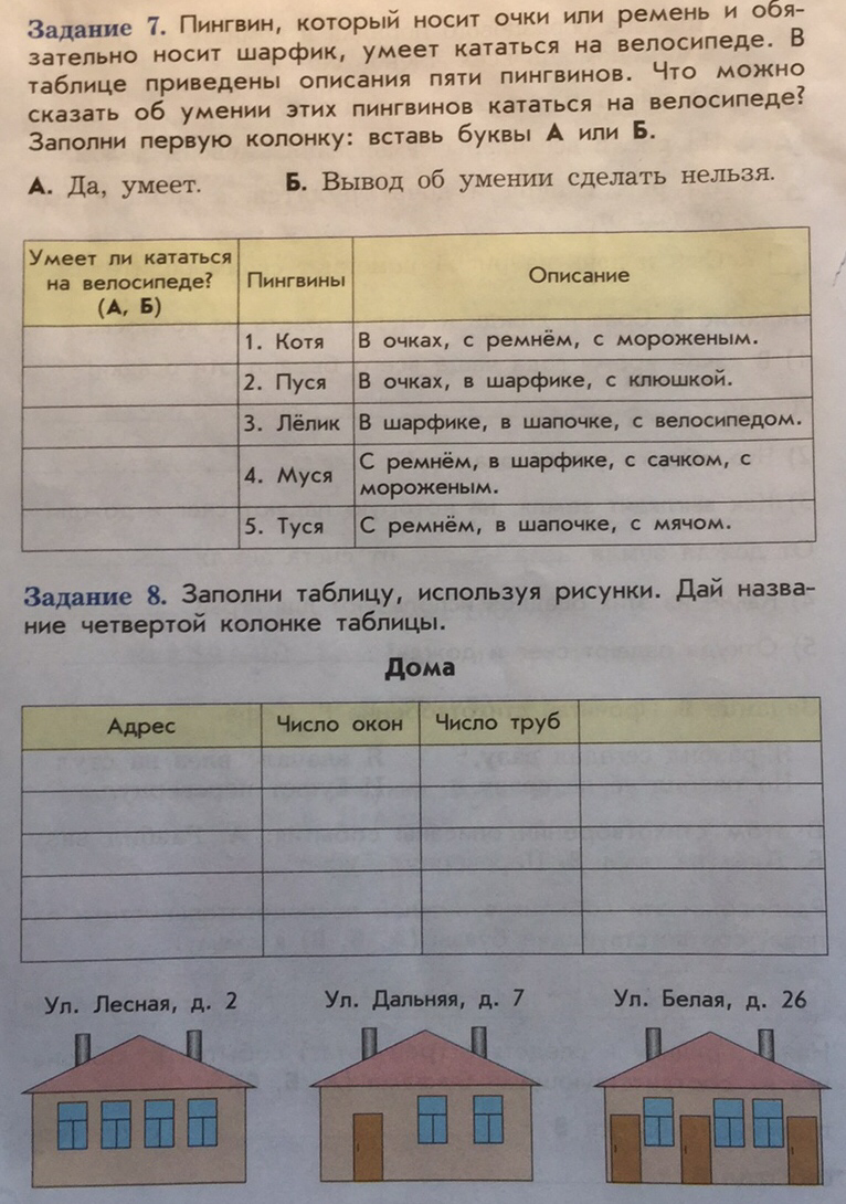 в первой таблице мне кажется что только Лёлик может кататься на велосипеде так как у него он есть а об остальных вывод сделать об умении нельзя а во 2 таблице можно добавить вопрос о количестве дверей домов