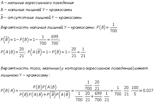 4. Установлено, что в среднем один из 700 детей мужского пола может родиться с лишней Y-хромосомой, и что у таких детей крайне агрессивное поведение встречается в 20 раз чаще. Пусть у мальчика агрессивное поведение. Какова вероятность того, что он имеет лишнюю Y-хромосому?