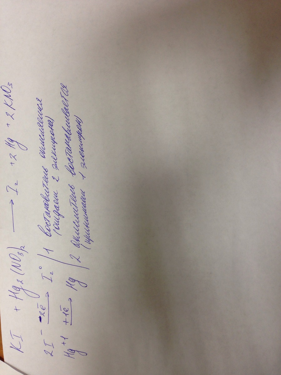 2KI[-1] (восст-ь) + Hg[+1]2(NO3)2 = I2 + 2Hg + 2KNO3: