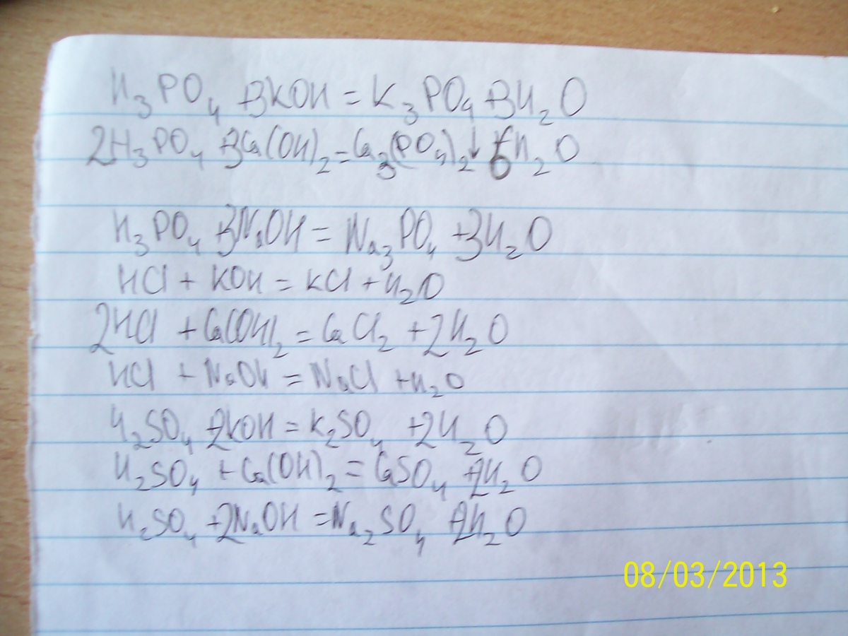 Напишите уравнения реакций нейтрализации, протекающих между следующими вецествами: H3PO4, KOH, Ca(OH)2, HCl, H2SO4, NaOH.