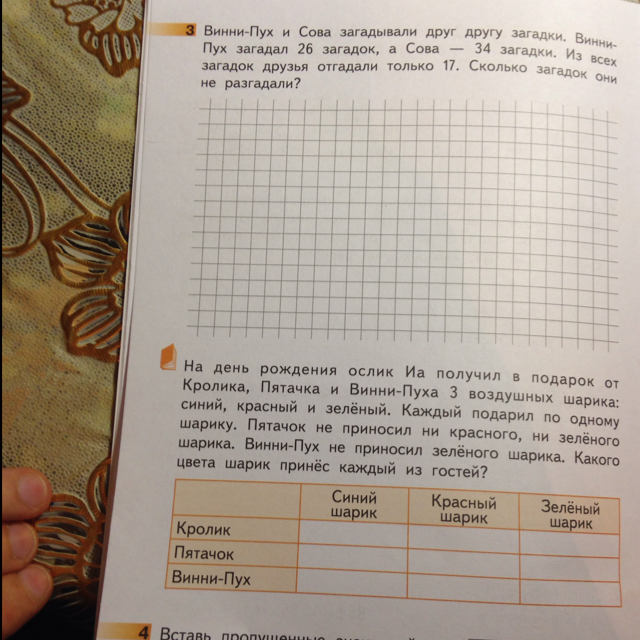 Ответ: зелёный у кролика; у винни красный; у пятачка синий.
