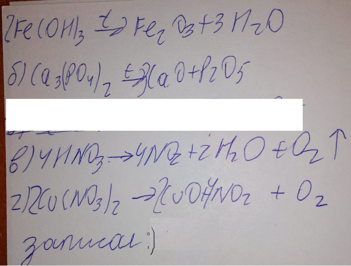 1 Запишите уравнения реакций разложения, схемы которых:а) Fe(OH)3 →t→ Fe2O3 + Н2O;б) Са3(РO4)2 →t→ СаО + Р2O5;в) HN03→t→ H2O + NO2 + O2;г) Cu(NO3)2 →t→CuO + NO2 + O2.