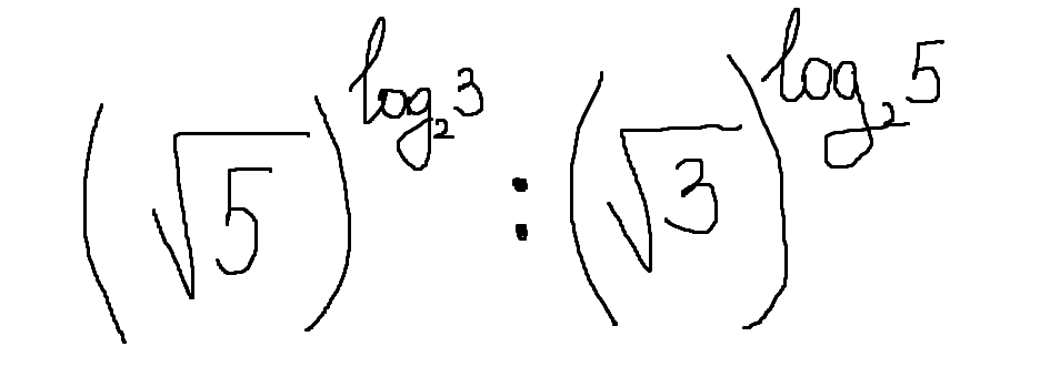 frac{ sqrt{5} ^{log_23}  }{ sqrt{3} ^{log_25}  } = frac{5 ^{log_43} }{3 ^{log_45} }  = frac{5 ^{ frac{1}{log_34} } }{3 ^{ frac{1}{log_54} } } = frac{5 ^{log_5_4} }{3 ^{log_34} } = frac{4}{4} =1.