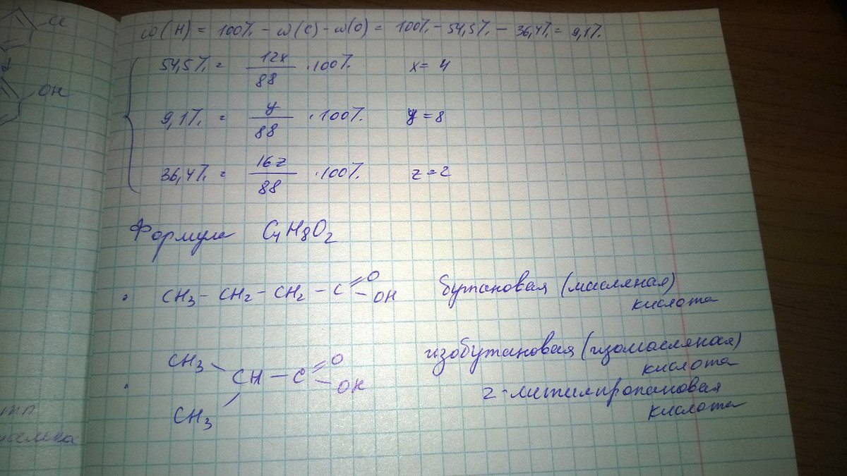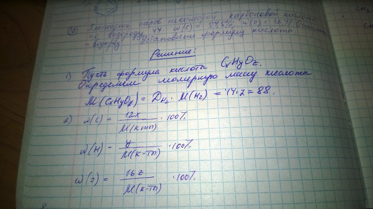 Найти молекулярную формулу карбоновой кислоты, содержащей (по массе) 54,5 % углерода, 36,4 % кислорода, остальное – водород. Плотность паров по водороду этого соединения 44.