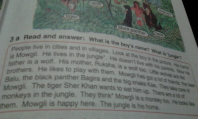 Люди живут в городах и сёлах. Посмотрите на мальчика на картинке. Его зовут Маугли. Он живет в джунглях. Он не живет со своими родителями. Теперь его отец - волк. Его мама Рукша тоже волчица. Маленькие волчата - это его братья. Он любит играть с ними. У Маугли очень много друзей: медведь Балу, черная пантера Багира и большая змея Каа. Они заботятся о Маугли.Тигр Шерхан хочет съесть его. В джунглях много обезьян. Они считают, что Маугли тоже обезьяна. Он очень похож на них. Маугли счастлив здесь. Джунгли - его дом.