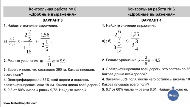 3вариант. 1 задание:а)4,2/25,2=21/5:126/5=1/6; б) 2 2/5/ 1 1/15=12/5: 16/15=9/4=2 1/4;в) 1,56/ 2 1/6=1 23/50: 2 1/6=73/50:13/6=219/325. 2задание: m-2/11m=9,9 ; 9/11m=9,9; m=9,9:9/11=9 9/10:9/11=99/10:9/11=121/10=12,1. 4задание: 85%=0,85; 1)18×0,85=15,3(км); 2)15,3+18=33,3(км)-длина всей дороги. 5задание: 0,3×0,8k=9,72; 0,8k=9,72:0,3 ;0,8k=32,4; k=32,4:0,8=40,5.........4вариант.2задание: k-2/5k=4,5; k-0,4k=4,5 ;0,6k=4,5 ;k=4,5:0,6=7,5. 5задание: 0,7×0,6m=8,61; 0,6m=8,61:0,7; 0,6m=12,3; m=12,3:0,6=20,5..(В 3 задании в обоих вариантах опечатка пропущена дробь,а 4 задание В 4 варианте не полностью видно задание,но эта задача решается так же как и 4 В 3 варианте,если не сможешь ,скинь В комментариях,я помогу)
