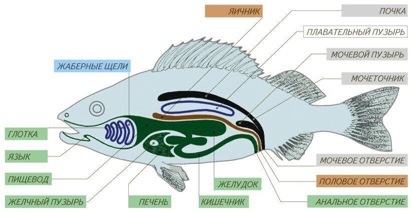 Внутренние органы рыбы располагаются с брюшной стороны между ребрами. Под жаберными крышкми в глотке находятся органы дыхания рыбы - жабры. Они представляют собой жаберные дуги с жаберными лепестками, которые пронизаны кровеносными сосудами . В них проиходит газообмен: кровь отдает углекислый газ и обогащается кислородом. Рот переходит в глотку, потом пищевод и далее желудок. Кишечник занимает бОльшую часть брюшной полости. В тонкий кишечник впадают протоки печени. Хрошо заметен желчный пузырь. Чуть дальше глотки под печенью лежит двухкамерное сердце. Над желудком расположен плавательный пузырь - орган, помогающий рыбе изменять глубину погружения. Ближе к анальному отверстию раполагаются половые железы (яичники или семенники) Созревая, они увеличиваются в размере и занимают место между кишечником и плавательным пузырем. Над плавательным пузырем, прилегая к позвоночнику лежит почка. Три отверстия около анального плавника - это анальное отверстие, половое и мочевое.