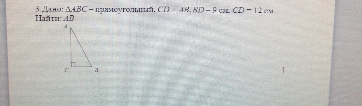 CB=sqrt (81+144)=15; треугольник СDB подобен треугольнику ABC , т.к. угол АВС смежный и второй угол 90 градусов. найдем коэфициент подобия: к = CB/BD=15/9=5/3; AB подобно СВ и равно = 15*5/3=25;