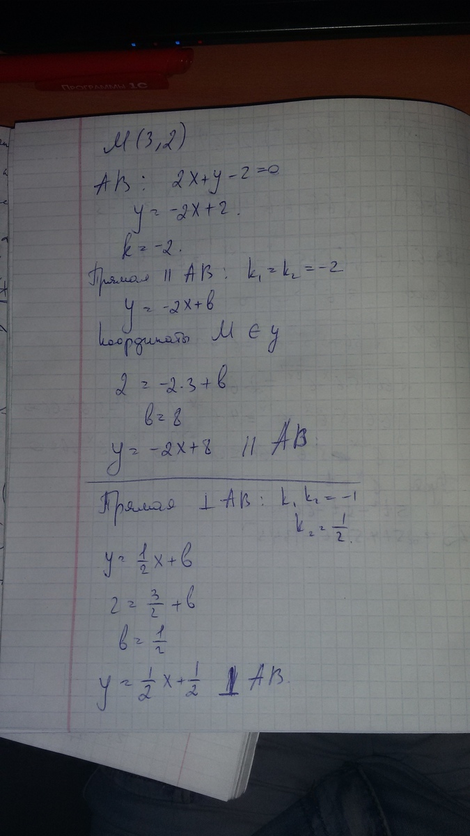 Через точку провести прямые параллельно, перпендикулярно к прямой AB. Сделать чертеж. M(3,2) AB 2x+y-2=0
