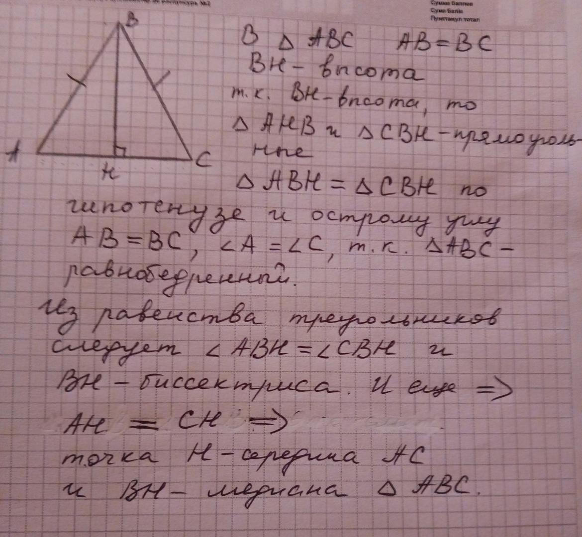 Доказать, что высота равнобедренного треугольника, проведенная к основанию, является медианой и биссектрисой