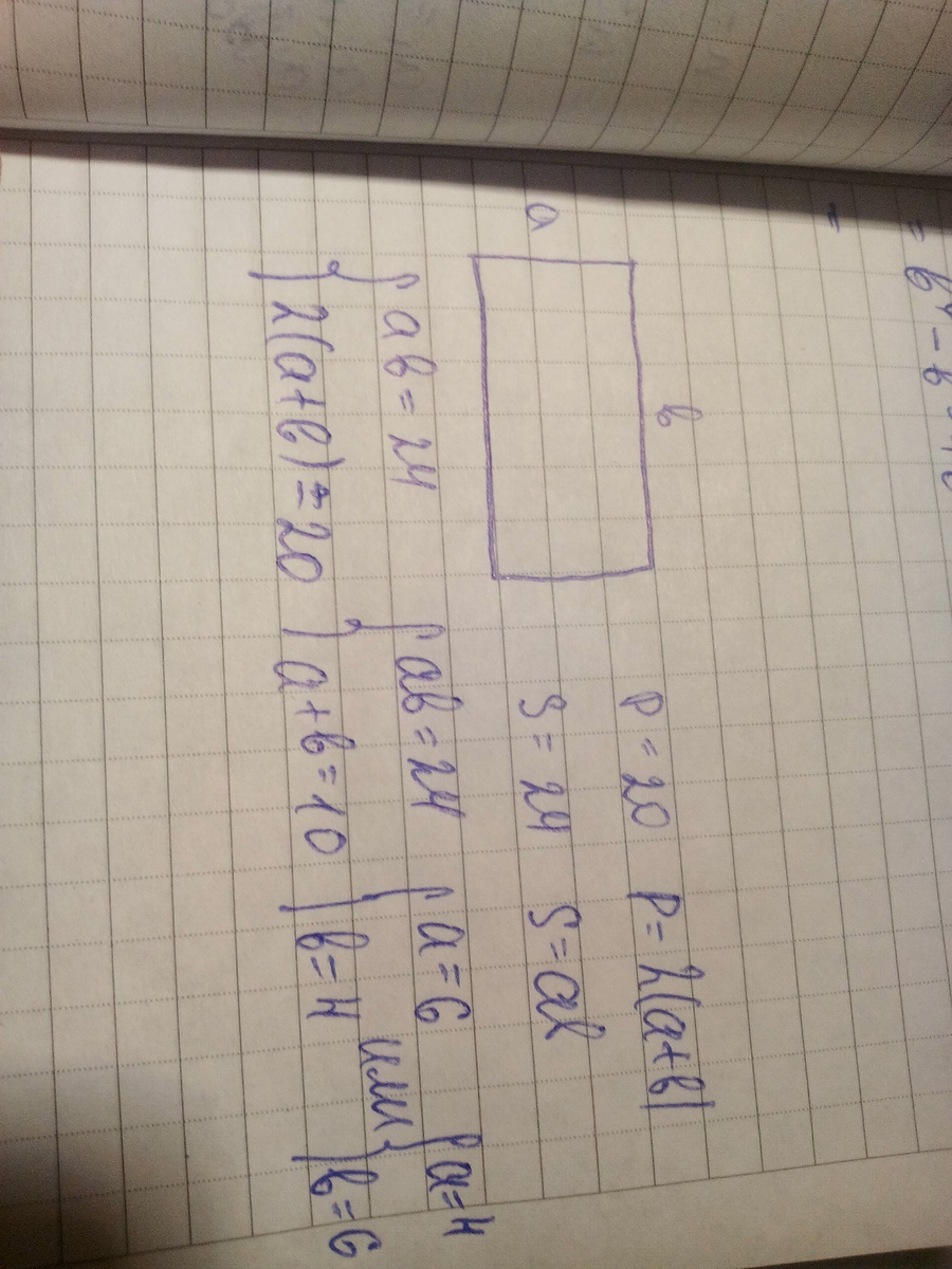 Периметр прямоугольника равен 20 см.Найдите его стороны если известно что площадь прямоугольника равен 24 см(в квадрате)
