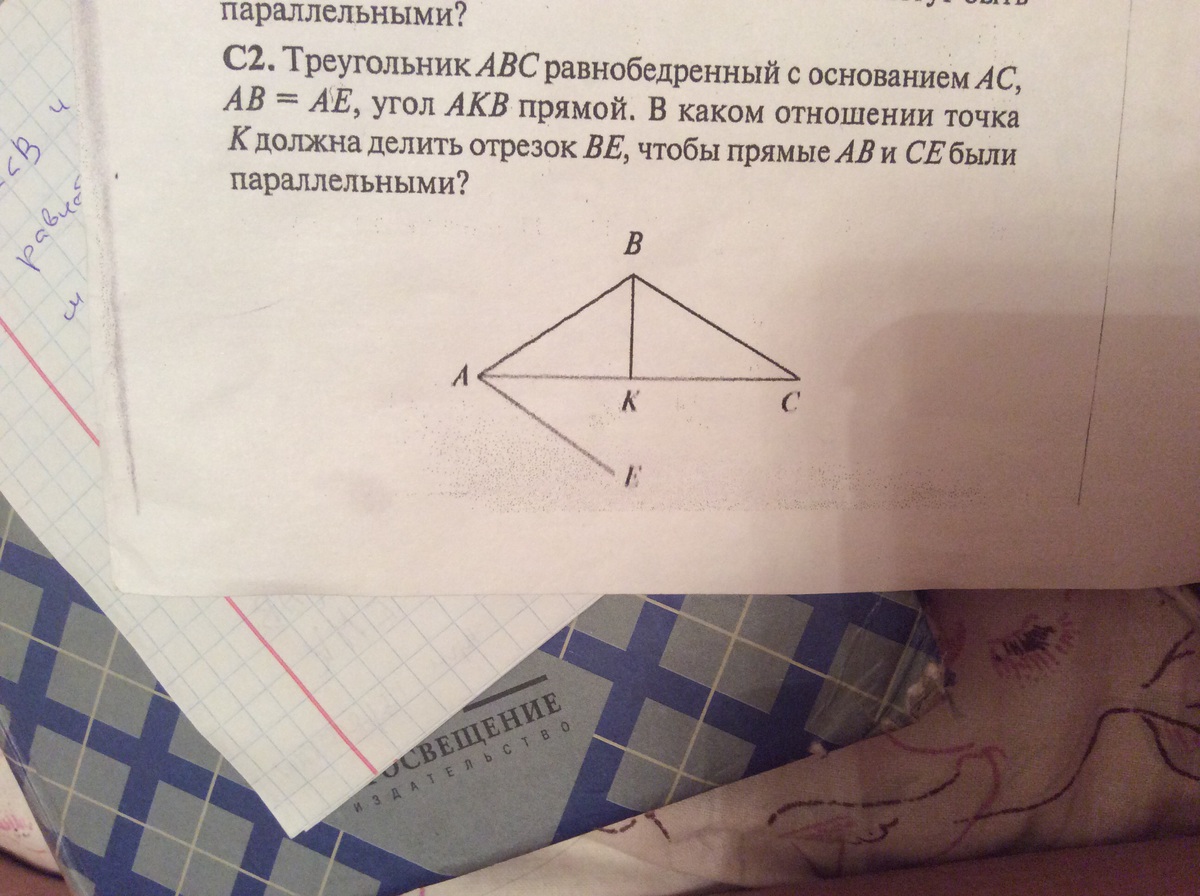 Значит, точка К должна делить отрезок ВЕ пополам, т.е. в отношении 1 : 1.