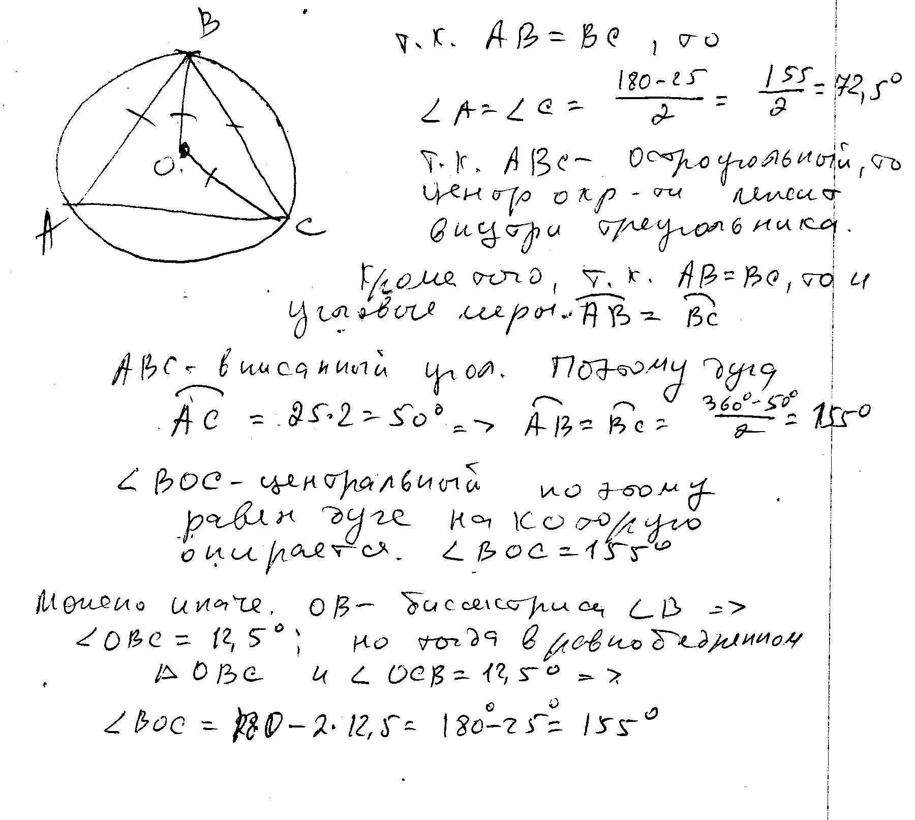 котором АВ=ВС и угол АВС=25 градусов. Найдите величину угла ВОС.