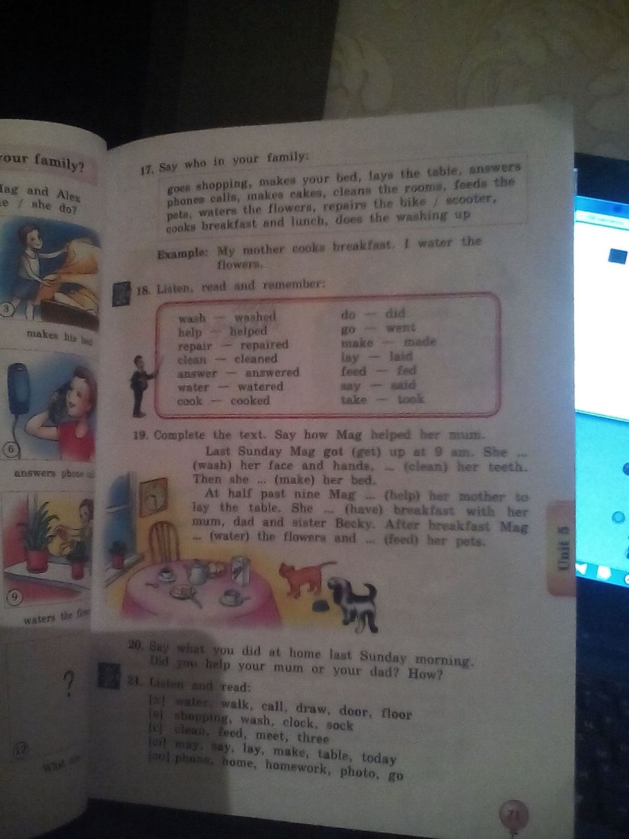 Все глаголы в этом тексте должны стоять в прошедшем времени! (get в got; wash-washed и т.д). У тебя таблица с формами прошедшего времени над текстом