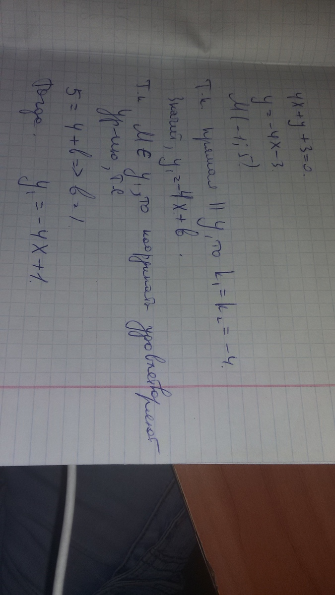 Запишите уравнение прямой, которая параллельна прямой 4 х + у + 3 = 0 и проходит через точку (-1; 5).