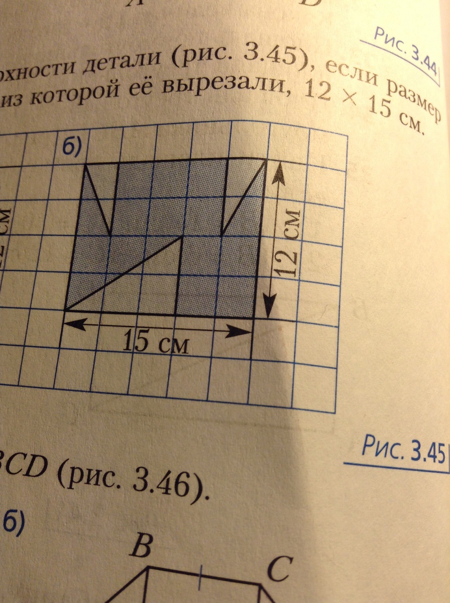 Вычислить площадь поверхности детали (рис 3.45) если размер прямоугольной пластины ,из которой ее вырезали 12умножить 15с м