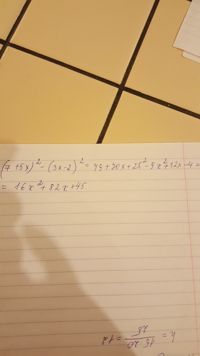 (7+5х)^2-(3х-2)^2= 49+70х+25х^2-9х^2+12х-4= 16х^2+82х+45