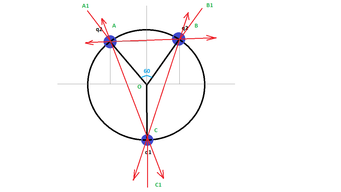 По кольцу, расположенному горизонтально, могут свободно перемещаться три шарика. Заряд первого шарика q1, второго и третьего q2 каждый. Чему равно отношение зарядов q1/q2, если при равновесии дуга между зарядами составляет 60°?