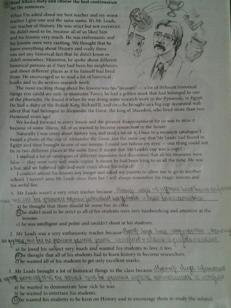 Самой восхитительной частью его уроков было его сокровище - масса разных исторических вещей, которые мы могли видеть только в музеях. Подумать только! у него была золотая маска принадлежавшая одному из фараонов. Он нашел её в Пирамидах, когда занимался исследовательскими работами в Египте. У него был дневник Британского короля Ричарда 3, А однажды он принес нам большой кубок украшенный серебром , принадлежавший Александру Великому, царю Македонии, который жил более 1000 лет назад!