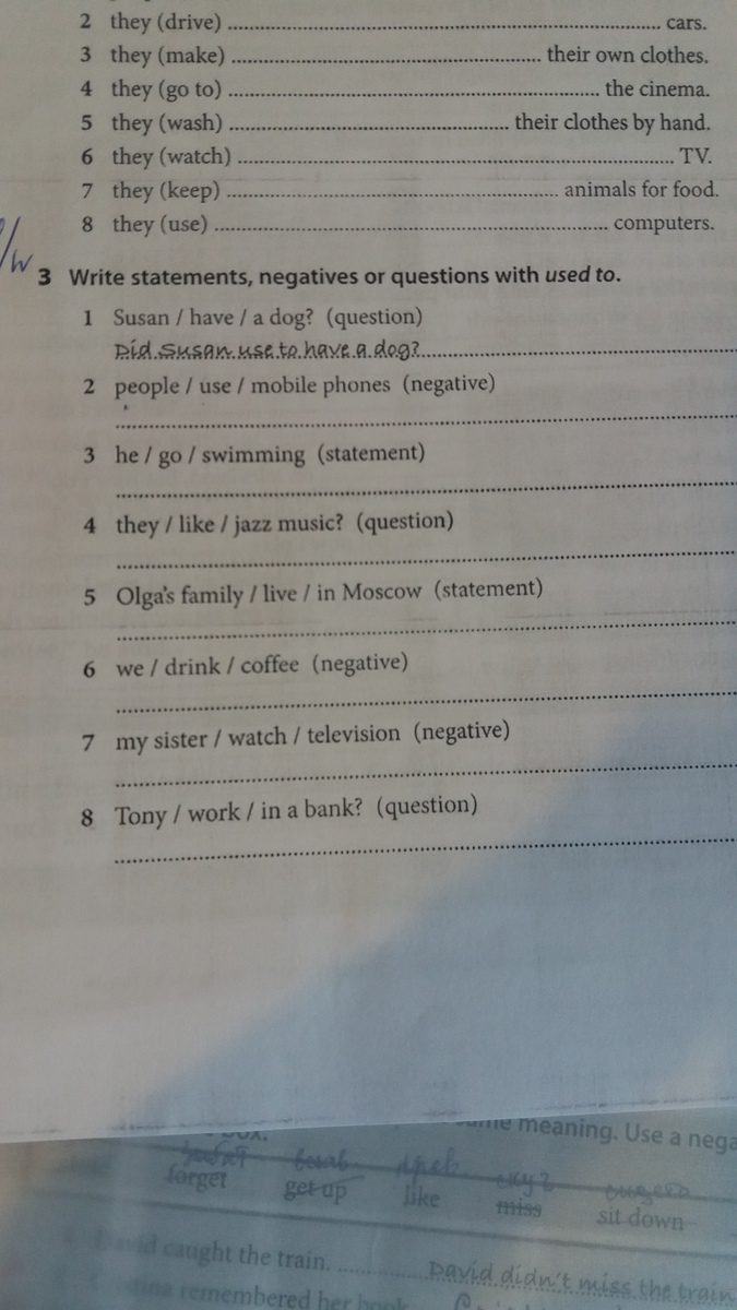 2) People didn't use a mobile phones.4) Did they like jazz music? 6) We didn't drink coffee. 7) My sister didn't watch televisions. 8) Did Tony work in a bank?