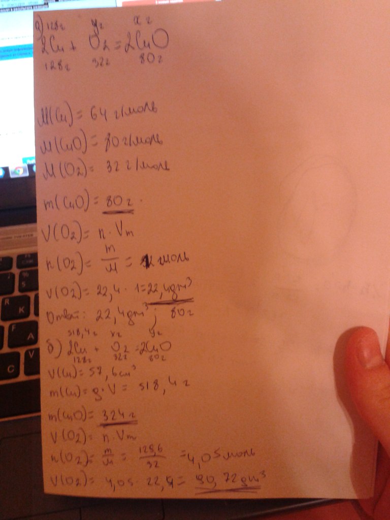 Рассчитайте объём(н.у) кислорода,который был израсходован в реакции окисления порции меди а)массой 128 г. б)объёмом 57,6 см3 (плотность меди принять равной 9 г/см3).Для обоих случаев вычислите массу оксида меди,который образует в результате реакции.