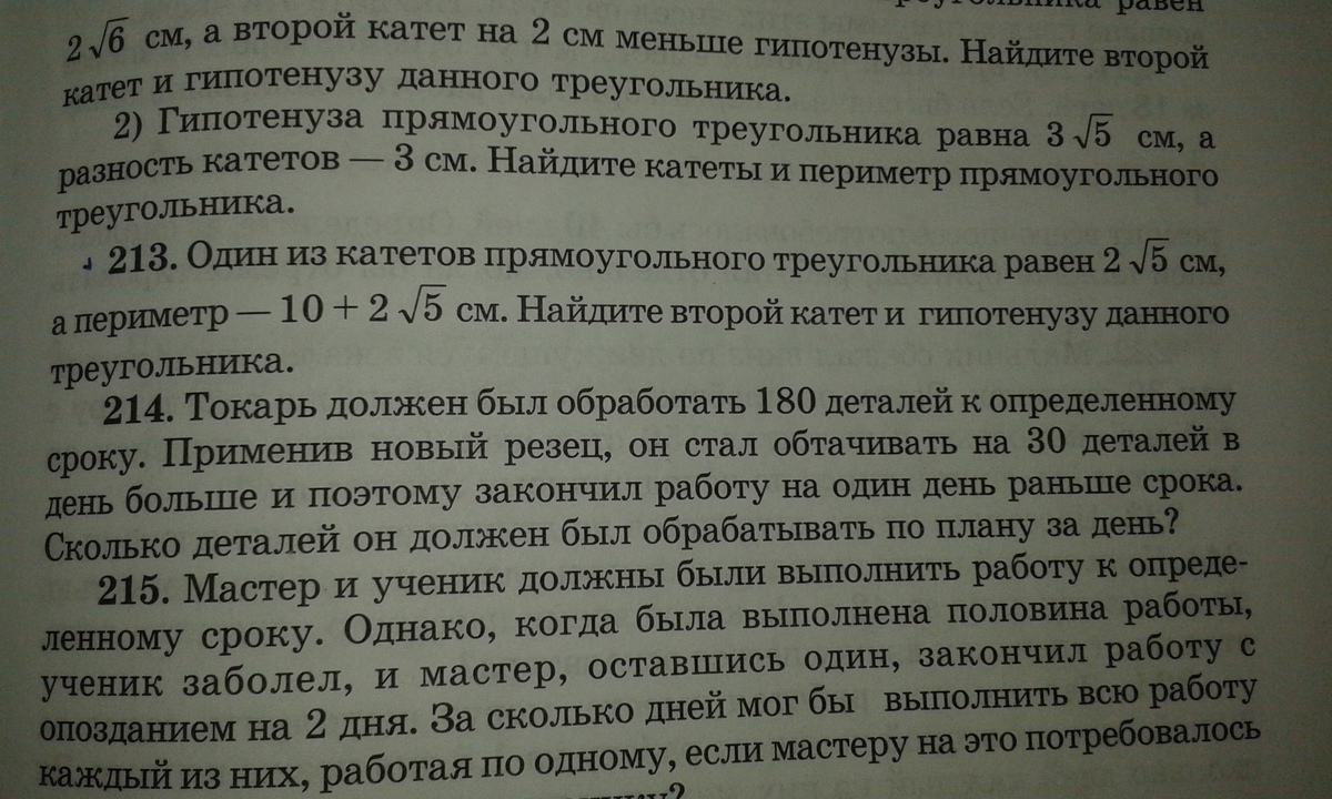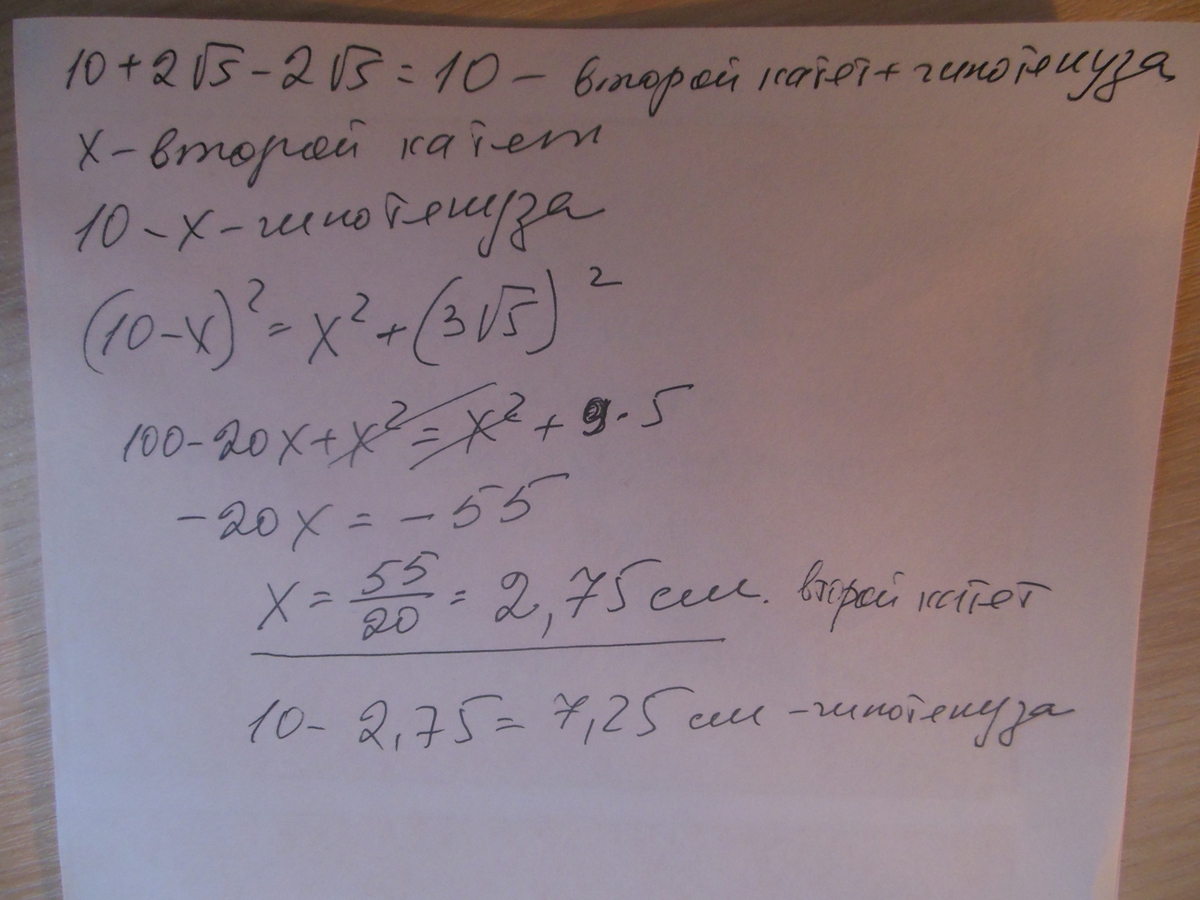#213 Один из катетов прямоугольного треугольника равен 2√5см,а периметр -10+2√5 см.Найдите второй катет и гипотенузу данного треугольника!