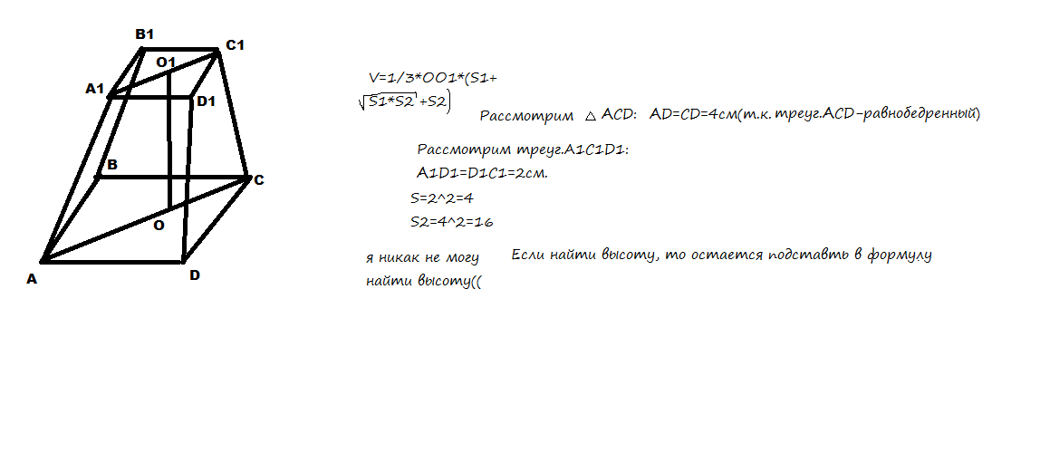 1.в правильной усеченной четырехугольной пирамиде диагонали оснований равны 2корень из 2 и 4 корень из 2 , в боковое ребро образует с плоскостью основания угол 60гр. наидите объем пирамиды