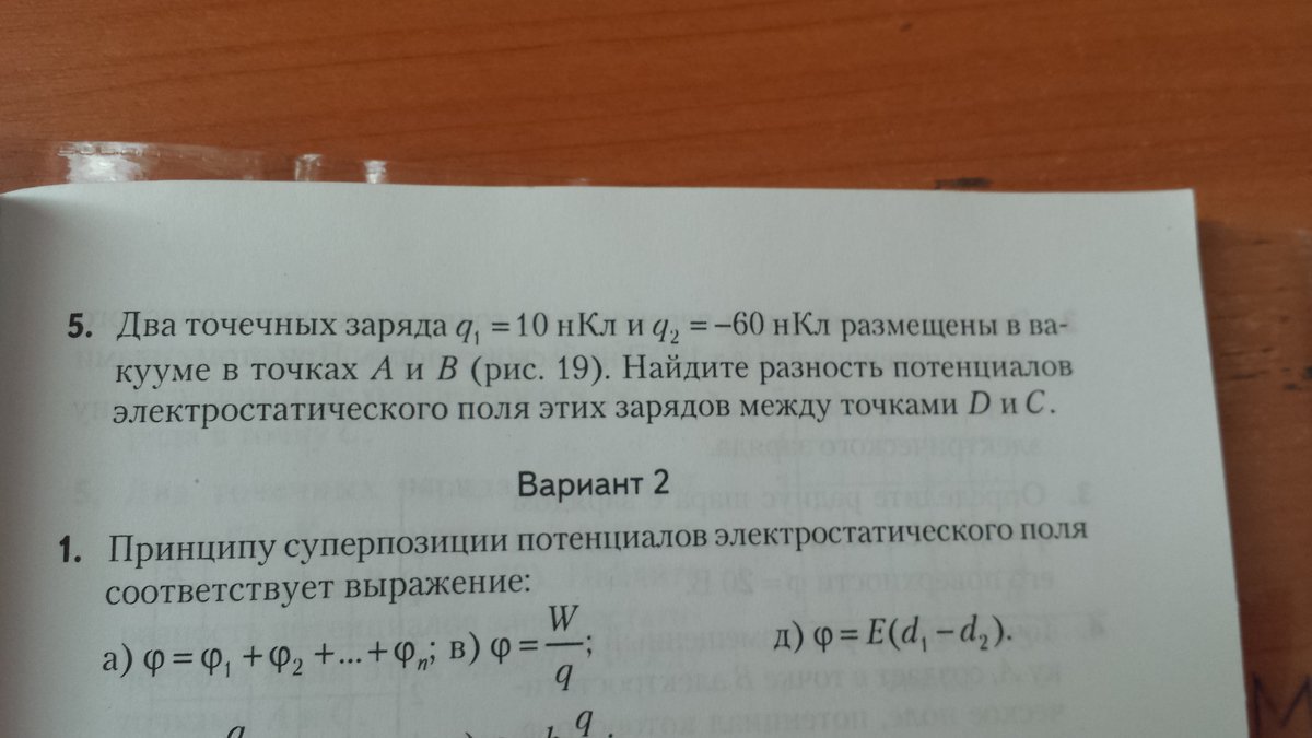 f(D) = 1/(4*pi*eo)*q1/AD+1/(4*pi*eo)*q2/BD - потенциал в точке D