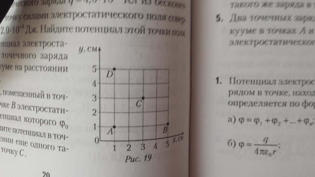 U = 1/(4*pi*eo)*(q1*(1/AD-1/АС)+q2*(1/BD-1/BC)) =