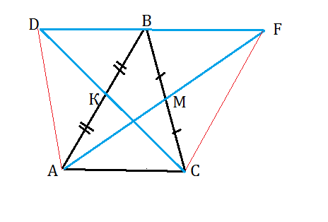 отрезки AM и CK-медианы треугольника АВС.На продолжении отрезка АМ за точку М отложен отрезок MF,а на продолжении отрезка CK за точку К- отрезок KD так,что MF=AM,KD=CK.Докажите,что точки В,D и F лежат на одной прямой.