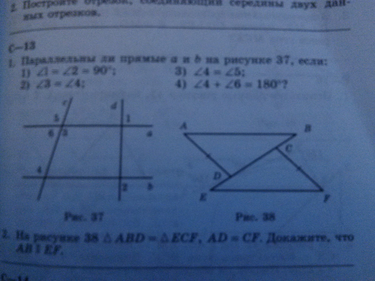 ΔABD=ΔECF , AD=CF поэтому ∠В=∠Е, т.к. в равных треугольниках против равных сторон лежат равные углы, а углы ∠В и ∠Е внутренние накрест лежащие при прямых АВ и ЕF и секущей ВЕ поэтому эти прямые АВ и ЕF параллельны. ч.т.д.