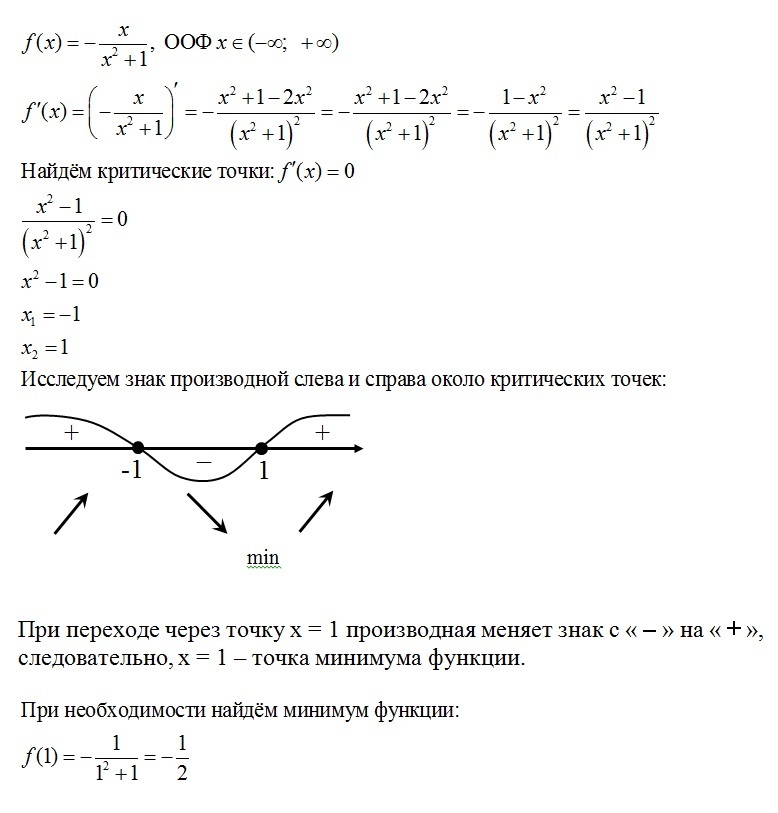 Найдите точку минимума функции y = - x / (x^2 + 1).