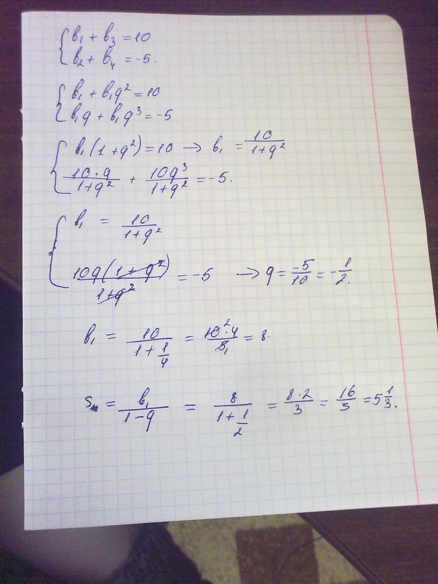 b₁ + b₁ · q² = 10 ⇒ b₁ (1 + q²) = 10 ⇒ b₁ = 10 : (1 + q²) (1)