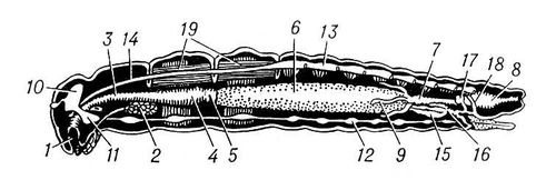 Схема внутреннего строения насекомого: 1 — ротовая полость; 2 — слюнные железы; 3 — пищевод; 4 — зоб; 5 — мышечный желудок; 6 — средняя кишка; 7 — тонкая кишка; 8 — прямая кишка; 9 — мальпигиевы сосуды; 10 — головной мозг; 11 — подглоточный ганглий; 12 — брюшная нервная цепочка; 13 — спинной сосуд; 14 — аорта; 15 — яичники; 16 — яйцеводы; 17 — семяприёмник; 18 — придаточные железы; 19 — крыловые мышцы средне- и заднегруди.