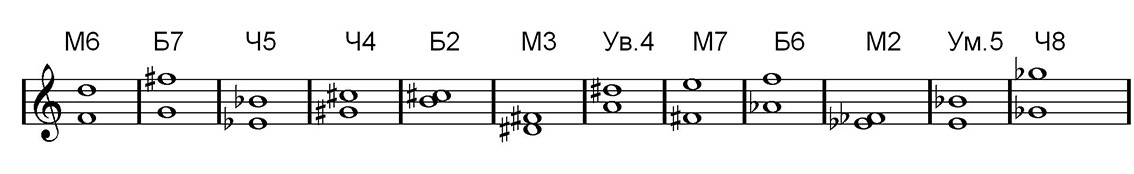 м.6 от фа; б.7 от соль; ч.5 от ми бемоль; ч.4 от соль диез; б. 2 от си; м.3 от ре диез; ув.4 от ля; м.7 от фа диез; б. 6 от ля бемоль; м.2 от ми бемоль; ум.5 от ми; ч 8 от соль бемоль