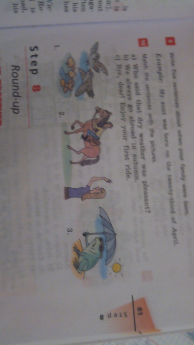 a) Кто сказал, что сухая погода это приятно? b) Осенью мы всегда выезжаем заграницу. c) Пока, дорогой! Наслаждайся своей первой поездкой.