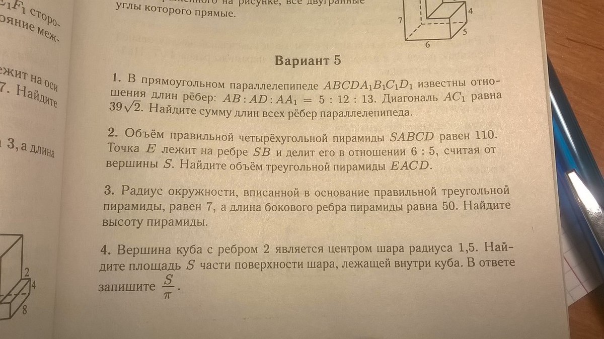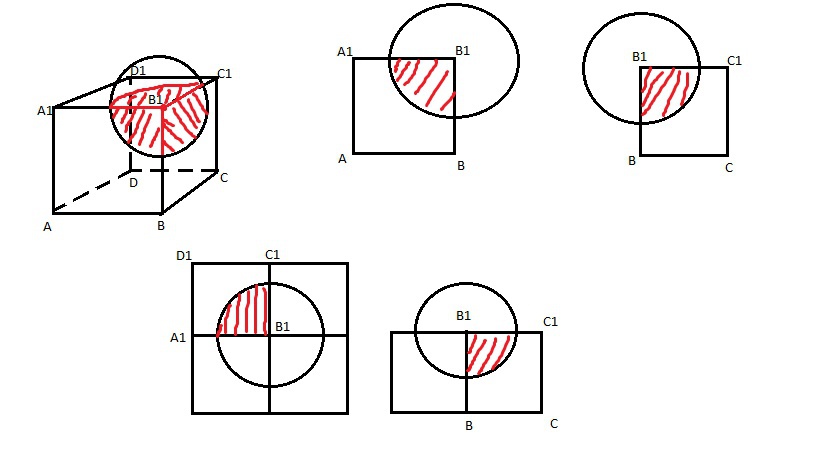 Задача 4. Здесь без пространственного воображения не обойтись. Из рисунка два видно, что площадь нужного нам шарового сегмента шара, который находится внутри куба, равна 1/4 половины площади поверхности шара, то есть, 1/8 площади поверхности всего шара. Площадь полной поверхности шара S = 4*pi*R^2 = 4*1,5^2*pi = 9*pi единиц. Имеем: площадь нужной поверхности шара равна: S = (9*pi)/8.