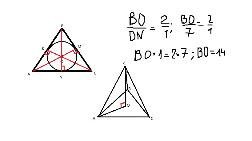 Задача 3. Правильная треугольная пирамида - это пирамида, в основании которой лежит правильный треугольник. Рассмотрим основание пирамиды SABC: в треугольнике ABC: AM = BN = CK - медианы треугольника, а поскольку треугольник правильные, они же являются биссектрисами и высотами. Исходя из свойства медиан, которые пересекаются в одной точке, которая делит их в отношении 2:1, считая их от вершины. Имеем: BO:ON = 2:1, ON - радиус, следует, BO:7 = 2:1; из пропорции находим BO = 2/1*7, BO = 14.