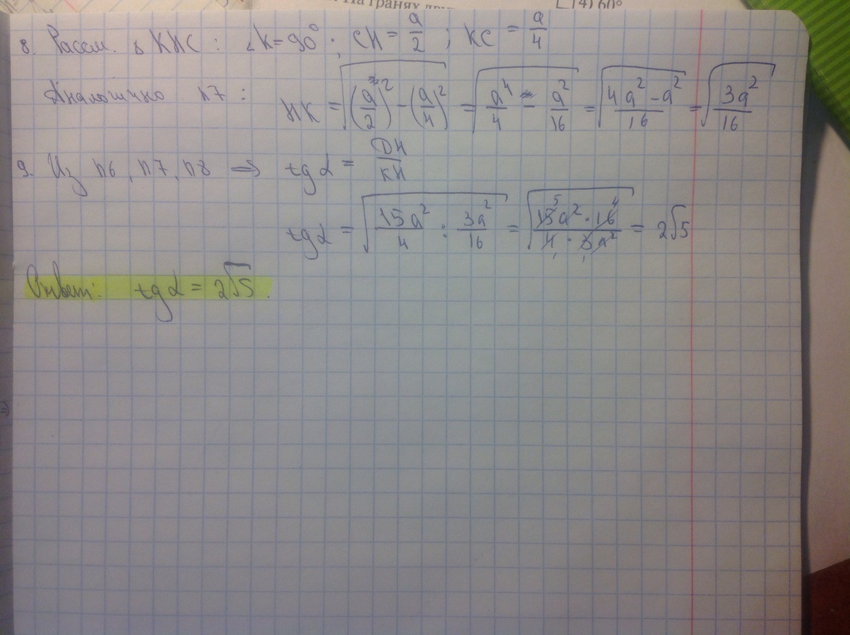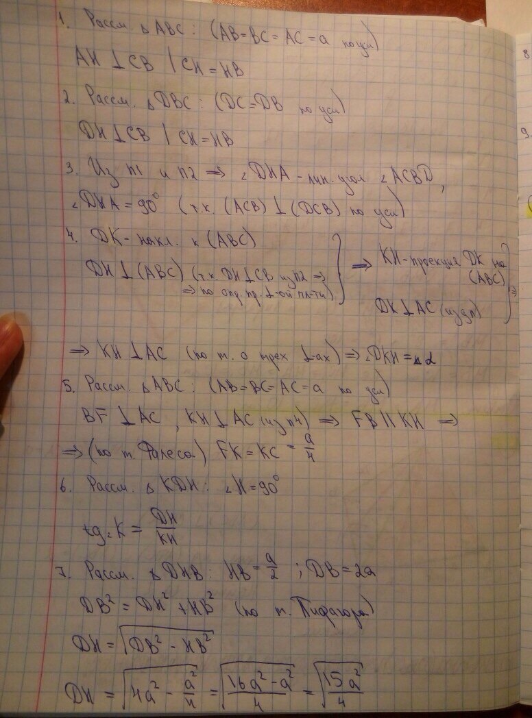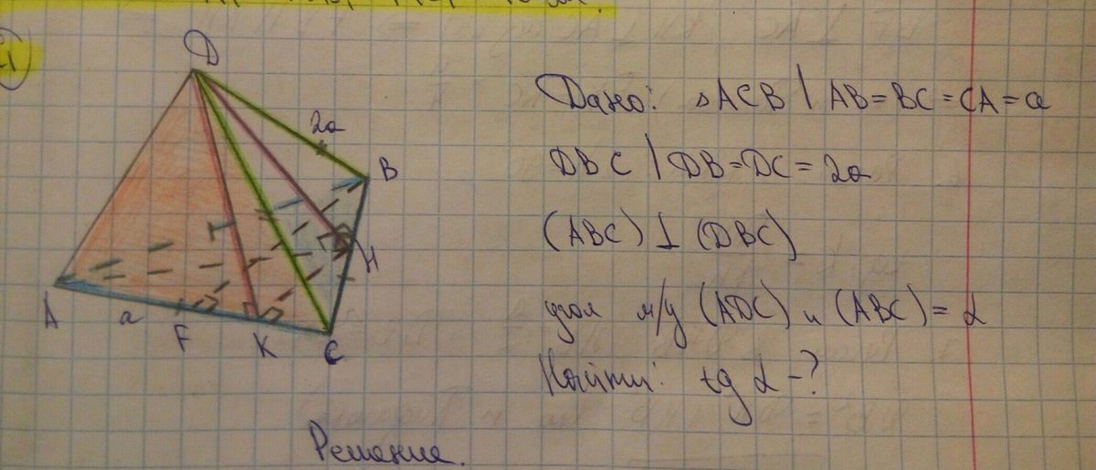 Сторона правильного треугольника ABC равна a. Треугольник DBC равнобедренный: DB=DC=2a. Их плоскости взаимно перпендикулярны. Найдите тангенс двугранного угла, образованного плоскостями ADC и ABC.