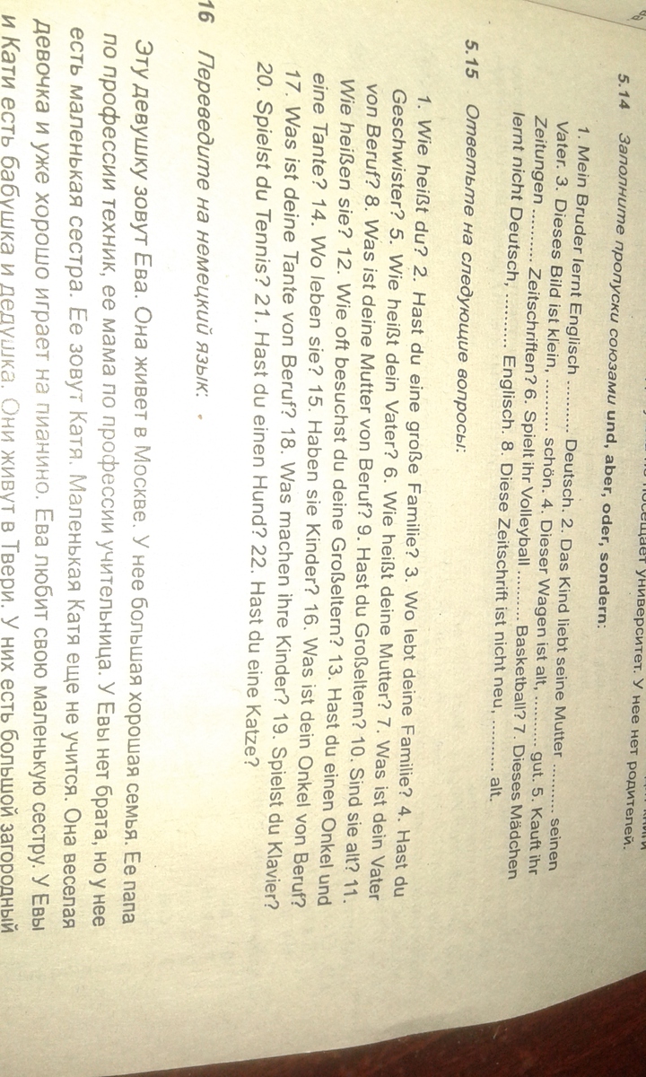 1. Ich heisse Alvira. 2. Ich habe eine grosse Familie. 3. Meine Familie lebt in der Stadt Kazan. 4. Ich habe Geschwister. 5. Mein Vater heisst Viktor. 6.Meine Mutter heisst Marina. 7. Mein Vater ist Ingenuier. 8. Meine Mutter ist Verkäuferin. 9. Ich habe Grosseltern. 10. Sie sind nicht alt. 11. Sie heissen Ruslan und Ludmila. 12. Ich besuche sie nicht oft. 13. Ja. Ich habe Onkel und Tante. 14. Sie leben in einem anderen Stadt. 15. Sie haben Kinder. 16. Ich weiss nicht, was mein Onkel von Beruf ist. 17. Meine Tante ist Hausfrau. Sie arebeitet nicht. 18. Ihre Kinder gehen in den Kindergarten. 19. Nein, ich spiele kein Klavier. 20. Ich spiele Tennis gern. 21. Ich habe keinen Hund. 22. ich habe den Kater.