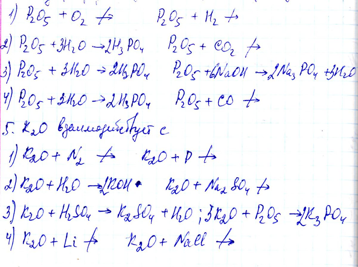 5. Ответ 3). K2O + H2SO4 = K2SO4 + H2O; 3K2O + P2O5 = 2K3PO4;