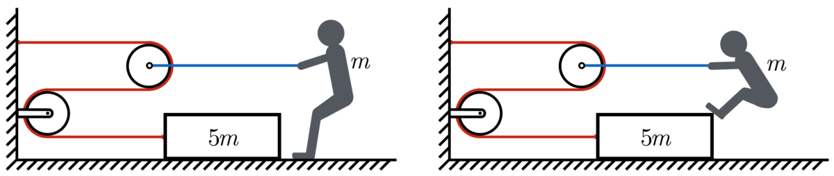 Человеку массой m требуется подтянуть к стене ящик массой 5m с помощью двух лёгких верёвок, а также подвижного и неподвижного блоков.